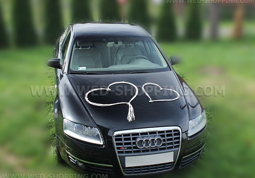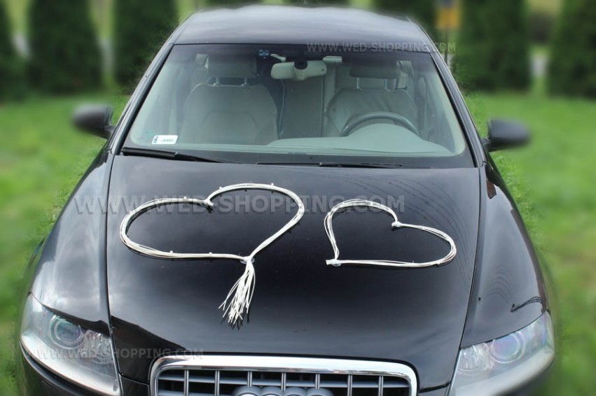 En unik dekoration gjord av rotting Satsen består av: - Två stora hjärtan med en bredd på ca 60 och 45 cm på motorhuven Alla element är utrustade med sugproppar som stadigt håller dekorationer på bilen. Hjärtan är dekorerade med konstgjorda pärlor.