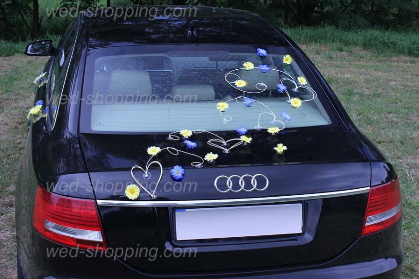 En uppsättning av dekorativa består av: 12 rotting kvistar tillsammans med hjärtan av alla storlekar - dekorerade med pärlor 28 av prästkragar på framsidan av bilen 12 tusenskönor bil sidled (3 på varje dörr) 10 av prästkragar på baksidan av bilen. Dessutom, 25 av tusenskönor i en andra färg Hela dekoration monteras på sugkoppar som är säkra för färgen. Finns även med tusenskönor i färgerna: vit, orange och grädde.