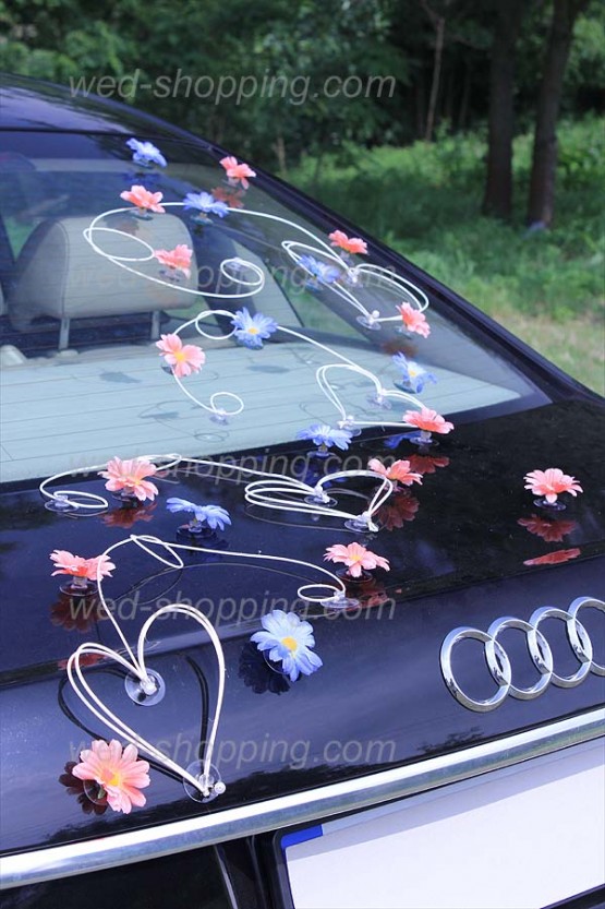 En uppsättning av dekorativa består av: 12 rotting kvistar tillsammans med hjärtan av alla storlekar - dekorerade med pärlor 28 av prästkragar på framsidan av bilen 12 tusenskönor bil sidled (3 på varje dörr) 10 av prästkragar på baksidan av bilen. Dessutom, 25 av tusenskönor i en andra färg Hela dekoration monteras på sugkoppar som är säkra för färgen. Finns även med tusenskönor i färgerna: vit, orange och grädde.