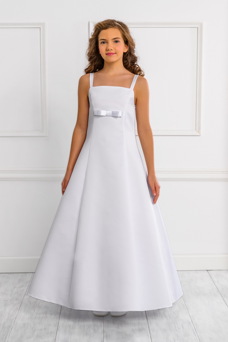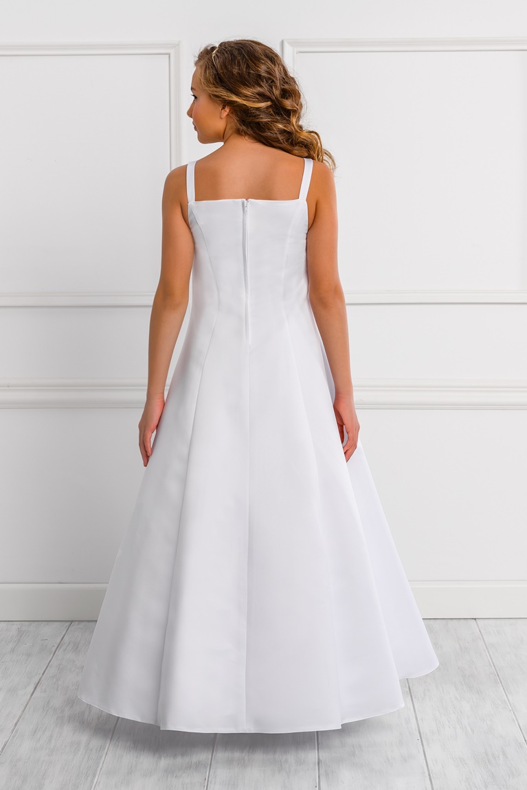 Med sitt vidsträckta och eleganta fåll blir denna långa klänning den perfekta outfiten för små flickor som vill stråla under sin första kommunion.