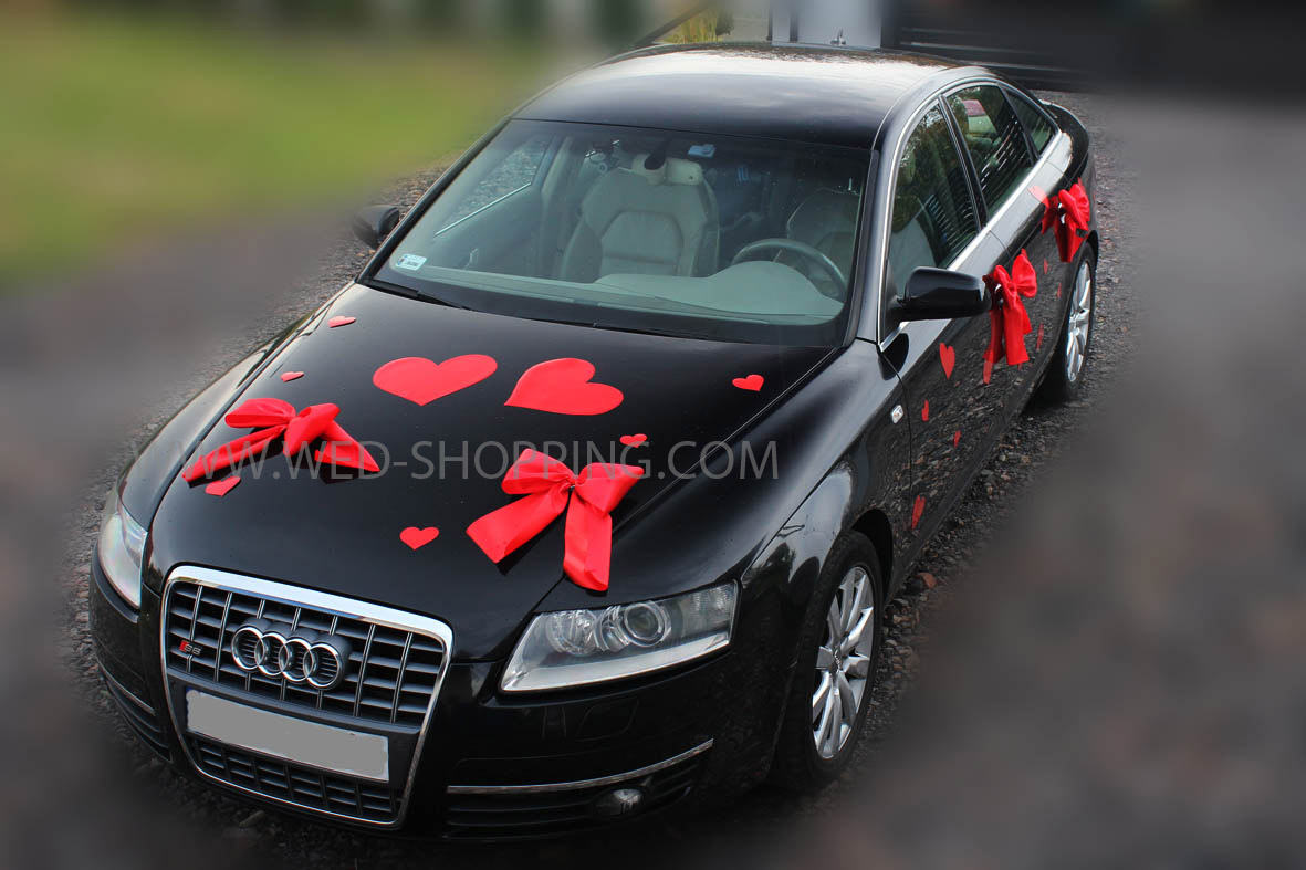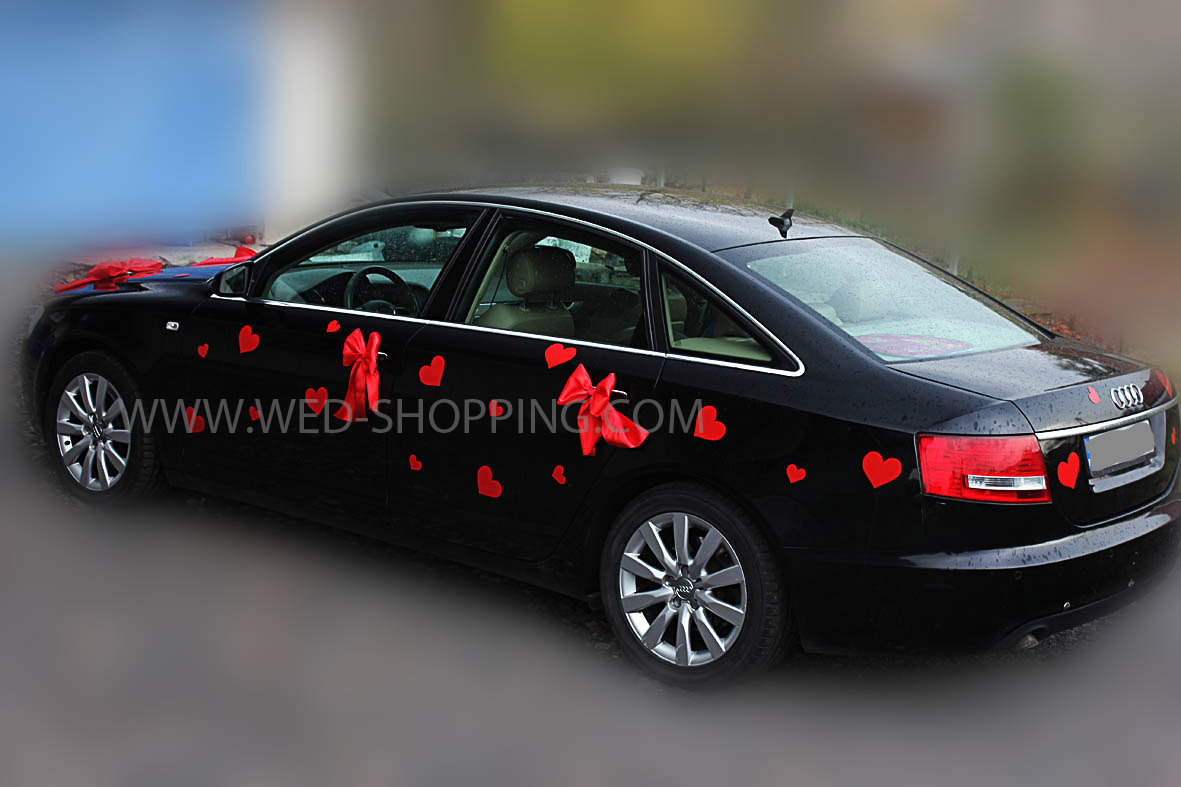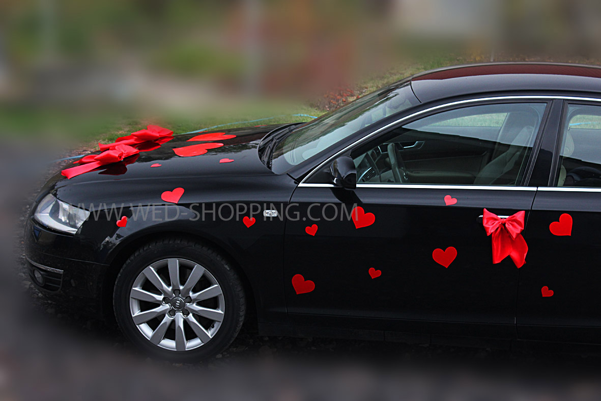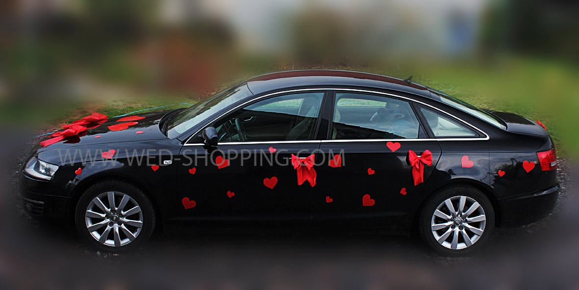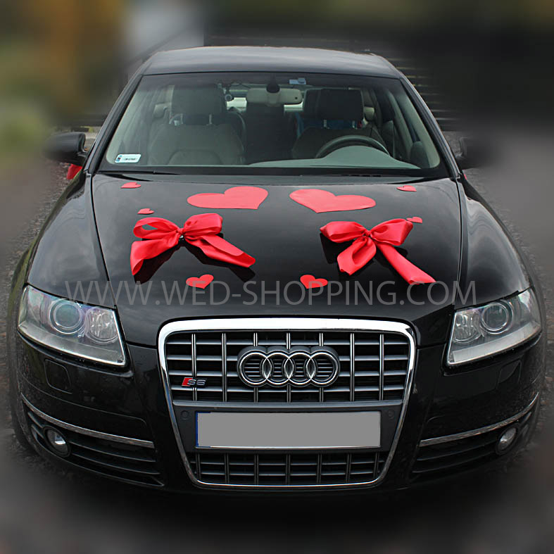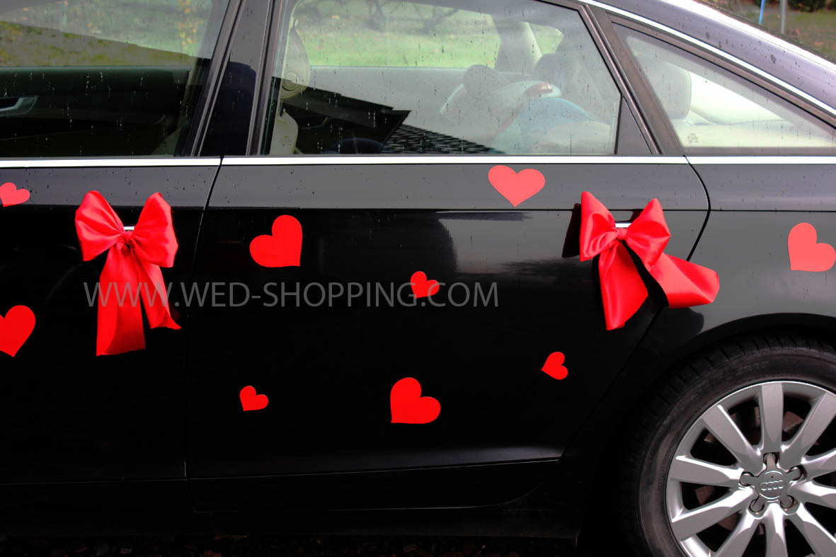 Kit de décoration sans fleurs pour voiture de mariage Le kit comprend: - 2 grands coeurs (30 cm) - 40 coeurs plus petits (11 et 6 cm) - 5 nœuds en satin pour la décoration de la porte et du dos - 2 plus gros nœuds en satin pour capot moteur peu importe la météo réutilisable élimination sans résidus Installation facile La décoration est sans danger pour la surface de la voiture La couleur rouge