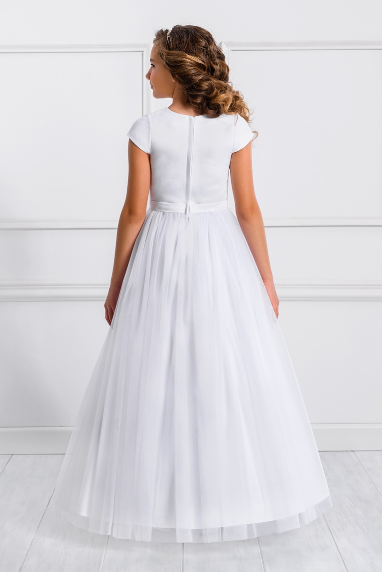 Med sin vidsträckta och eleganta nederdel blir denna långa klänning den perfekta outfiten för små flickor som vill stråla under sin första kommunion.