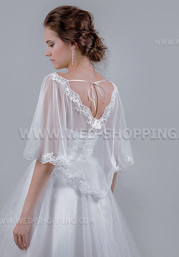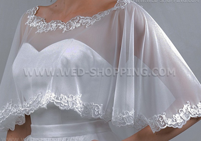 Vackra tyll cape med spets ringning och spets längs den nedre kanten. Utmärkt komplement till din axelbandslös brudklänning. En storlek.